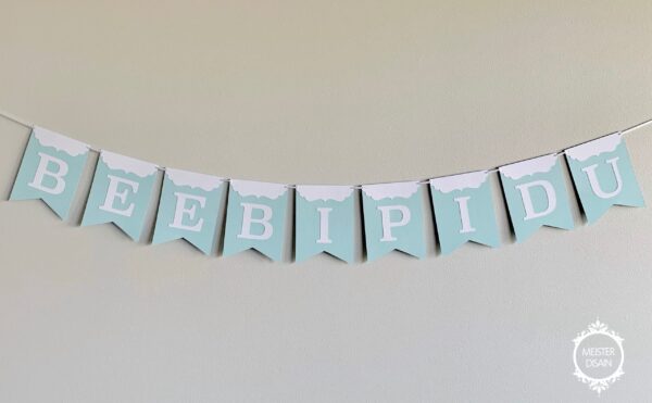 Pakis on 9 helesinist lippu, millel on valged tähed tekstiga BEEBIPIDU ja valget paela 3 meetrit.